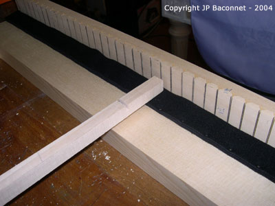 A l'extrémité du clavier, un peigne est collé; dans chaque fente va se mouvoir une pointe fixée à l'extrémité de chaque touche. L'espacement entre les fentes est le même que celui des pointes de balancement. Les pointes ayant le même diamètre que la largeur de la fente, il faut légèrement ovaliser la pointe à la lime et la toile émeri, en graissant au graphite et la pointe et la fente, pour éviter le bruit et les blocages !!! Au repos, l'extrémité de la touche repose sur trois épaisseurs de feutre noir, cloué sur le chassis. |